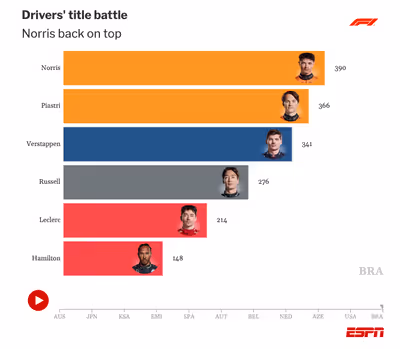 Norris leads on 390 points with 17 podiums and seven wins this season. Piastri sits on 366 points with 14 podiums and seven wins, while Verstappen totals 341 points, 12 podiums and five wins. With the title within reach for Norris, teams will juggle aggressive strategies and conservative point-scoring plans across the weekend.