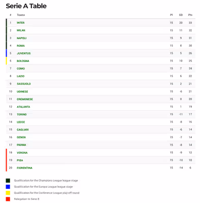 1 Inter — 33 pts (GD +20) 2 AC Milan — 32 pts (GD +11) 3 Napoli — 31 pts (GD +9) 4 Roma — 30 pts (GD +8) 5 Juventus — 26 pts (GD +5) 6 Bologna — 25 pts (GD +10) 7 Como — 24 pts (GD +7) 8 Lazio — 22 pts (GD +6) 9 Sassuolo — 21 pts (GD +2) 10 Udinese — 21 pts (GD -6) 11 Cremonese — 20 pts (GD 0) 12 Atalanta — 19 pts (GD +1) 13 Torino — 17 pts (GD -11) 14 Lecce — 16 pts (GD -8) 15 Cagliari — 14 pts (GD -6) 16 Genoa — 14 pts (GD -7) 17 Parma — 14 pts (GD -8) 18 Verona — 12 pts (GD -9) 19 Pisa — 10 pts (GD -10) 20 Fiorentina — 6 pts (GD -14)